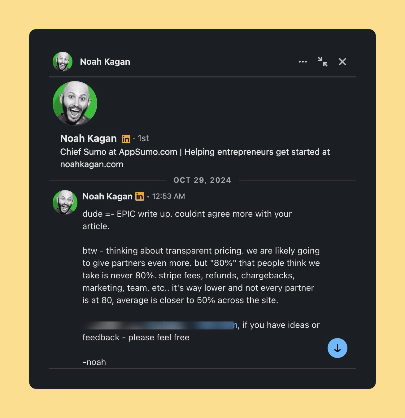 Edit 1: Chief Sumo, Noah Kagan read my article, and wrote out to me on LinkedIn and X to share their side of things. I was low-key surprised he read and replied. Here’s a screenshot of one of his message.